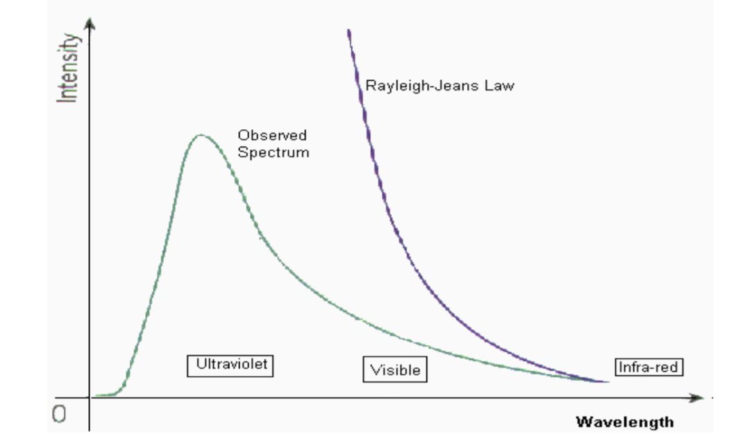 حيث يتنبّأ قانون رايلي - جينز باستمرار كثافة الطاقة (Energy Density) مع نقصان الطول الموجي (Wavelength) لكن في التجربة تصل الطاقة إلى قيمة عظمى ثم تبدأ بعدها بالنزول السريع.