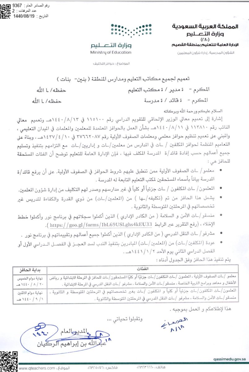 #تعليم_القصيم يمنح الحوافز لمعلمي/ات #الصفوف_الأولية والمُكلَفين اعتبارًا من نهاية دوام الخميس ١٤٤٠/٨/٢٠
