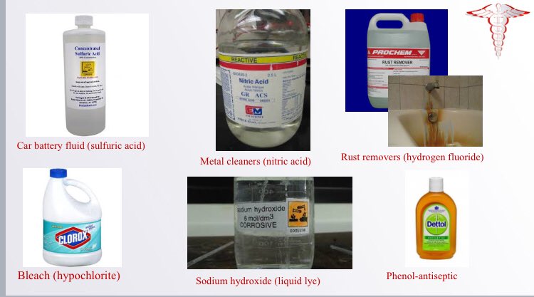 أشهر المواد الكيميائية الحارقةالحمضية والقلوية :مثل ماء البطارية/النار (حمض الكبريت)