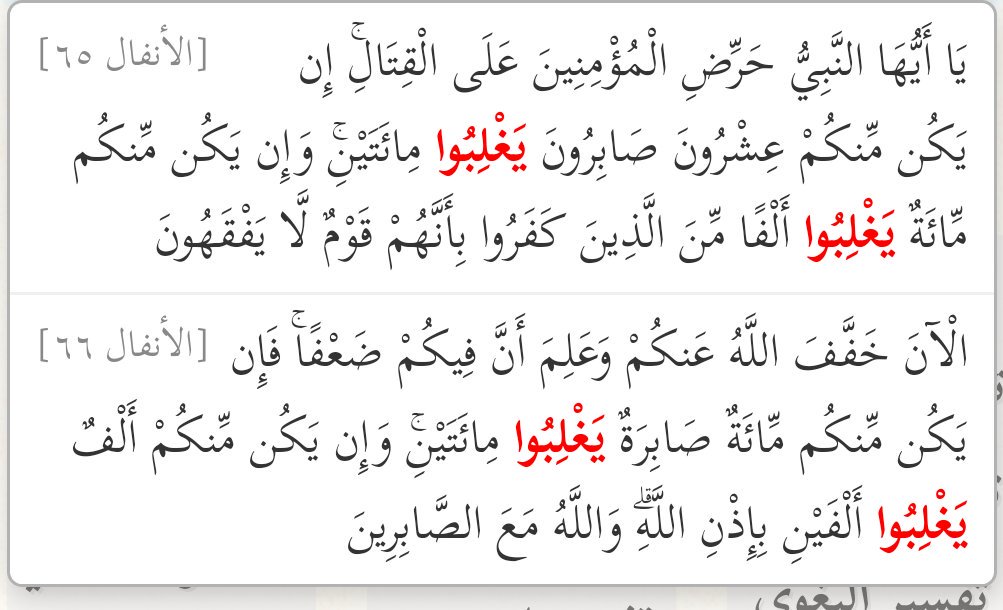 فالآية الأولى توجب على المؤمن مواجهة 10 من الكفار, وإذا فر شملته هذه الآية: یَـٰۤأَیُّهَا ٱلَّذِین ءامَنوا۟ إِذَا لَقیتمُ ٱلذِین كَفرُوا زَحۡفࣰا فَلَا تُوَلوهُمُ ٱلۡأدبَارَ (١٥) وَمن یُولِّهمۡ یَوۡمَئذࣲ دُبُرَه ... فَقدۡ بَاءَ بِغَضب من ٱللَّه وَمَأوَاه جهَنم وَبِئۡسَ ٱلۡمَصِیرُ