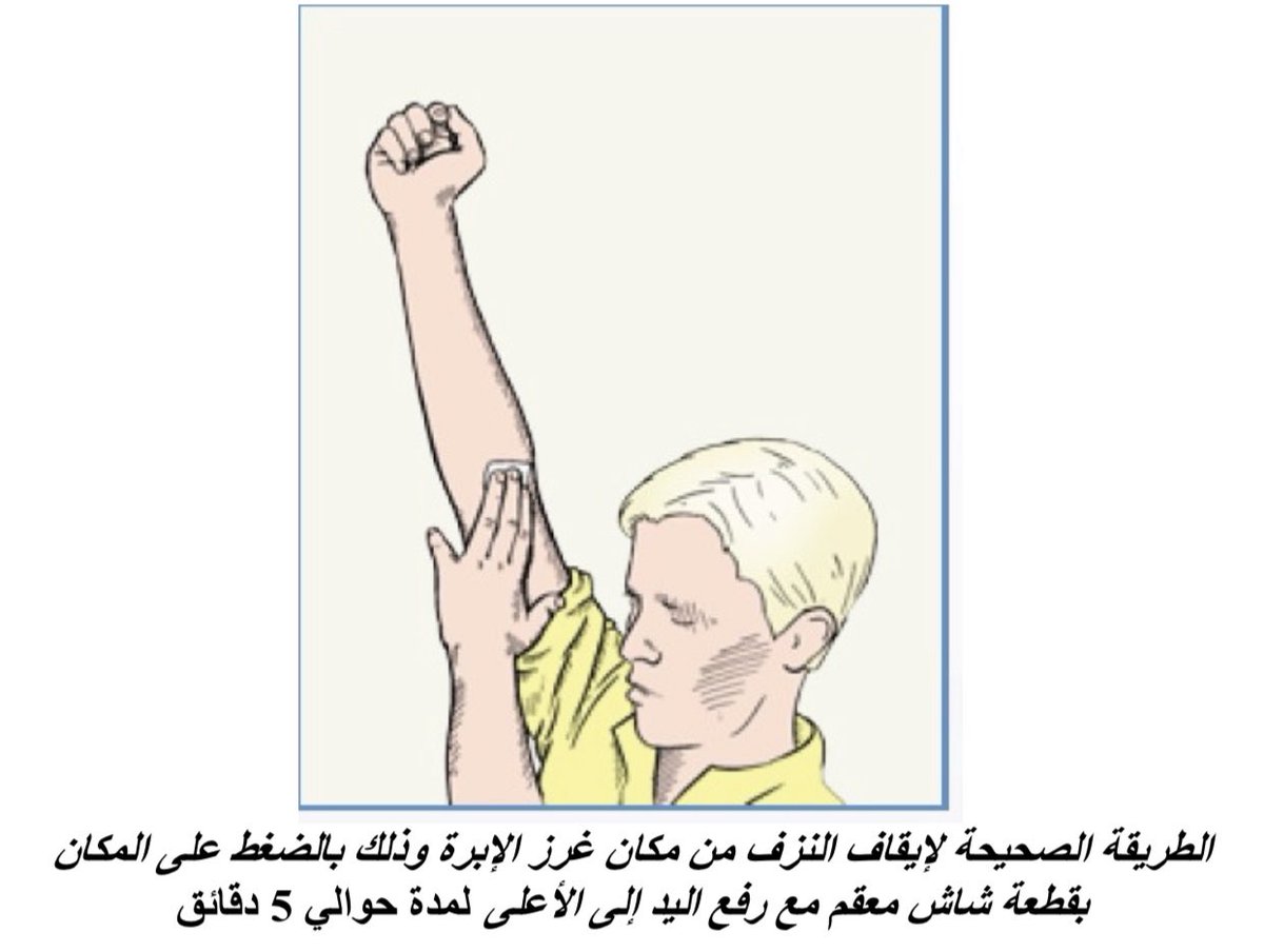 ٢-تحت تدفق الماء قم بعصر مكان الوخز لاخراج الدم كررها عدة مرات لمدة ٥ دقائق