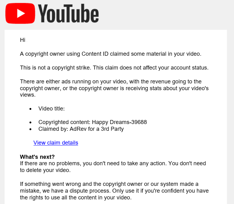 لا تؤثّر مطالة Content ID بشأن الفيديو على قناتك. وهذا ليس إنذار مخالفة حقوق الطبع والنشر Strike. لكنك لن تجني أرباح من هذا الفيديو فقط.