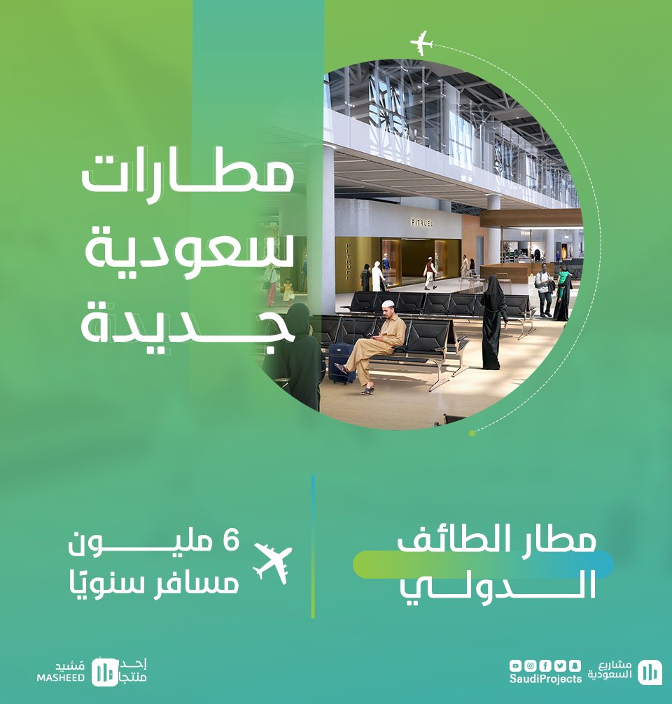 للطائف مشاريع عملاقة، وفرص للنمو واعدة، لذلك تعتزم المملكة إنشاء مطار دولي جديد تمامًا بسعة تبلغ 6 ملايين مسافر سنويًا، لربط #الطائف ببقية مدن المملكة والعالم