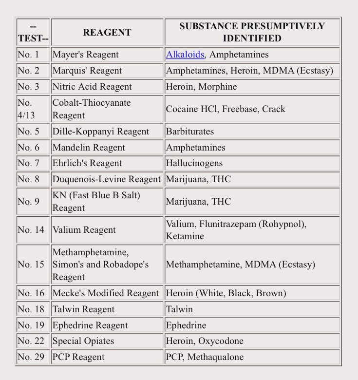 ملاحظة لايمكن الاكتفاء بنتائج الاختبارات المبدئية ولابد تطبيق تقنيات أخرى لتؤكد النتائج مثل الكروماتوقرافي ، هنا ملف يوضح فيه اجهزة الكروماتوقرافي مع الاختبارات المبدئية 👍🏼