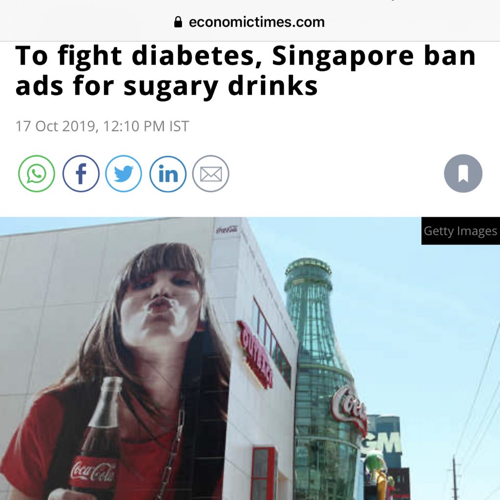 سنغافورة اول دولة في العالم تمنع اعلانات المشروبات المضاف لها سكر. وتنظر في امكانية اضافة ضريبة عليها او منعها منعا تاما في المستقبل.
