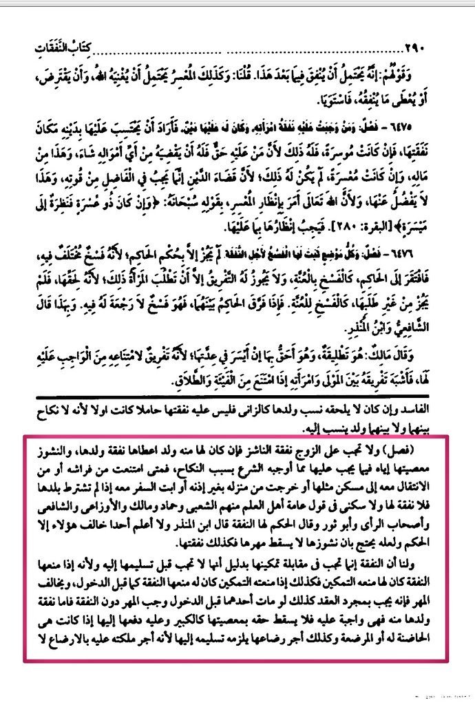 "فمتى امتنعت من فراشه أو خرجت من منزله بغير إذنه أو امتنعت من الإنتقال معه إلى مسكن مثلها أو من السفر معه فلا نفقة لها ولا سكنى في قول عامة أهل العلم.
