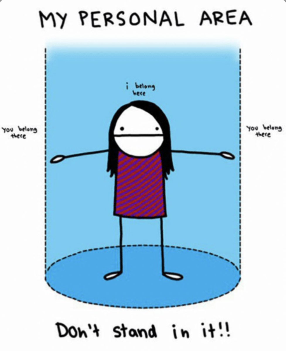 فلما توقف في الصرافة مثلا و تلقى احد مقرب منك بزيادة ، او وحدة غريبة تجي تحط يدها عليك ولا ودك تصير وقح معاهم بس في نفس الوقت ودك انهم يحترمون مساحتك الشخصية❗️و تستغرب ليش ما يحترمون ذي المساحة في نفس الوقت تجلس توسوس و تسال نفسك يمكن انت حساس بزيادة !