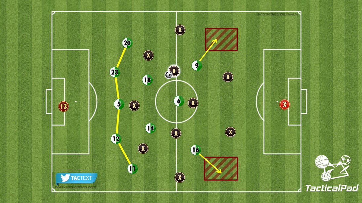 فأبرز الاختلافات بين نهج الفريق في الموسمين هو الاعتماد على هذه الفكرة بعد أن كان في السابق يهدف لاستغلال الكثافة العددية لفريقه على الطرف.