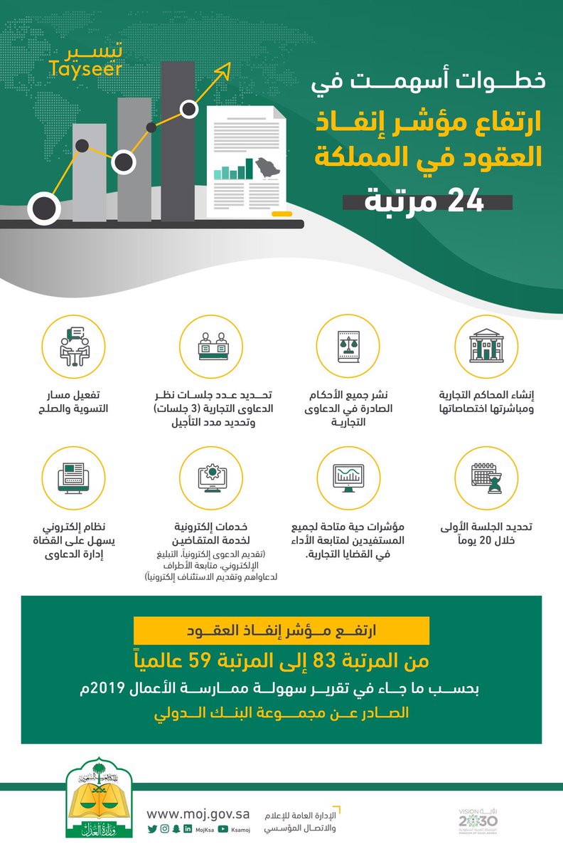 تقدمت المملكة في مؤشر إنفاذ العقود واحتلت #السعودية الأولى عالميا في إصلاحات بيئة الأعمال بين 190 دولة، حيث أصبحت هيبة قضاء التنفيذ بمثابة الضمانة لأداء الحقوق سواء بموجب السندات التنفيذية أو الأحكام القضائية