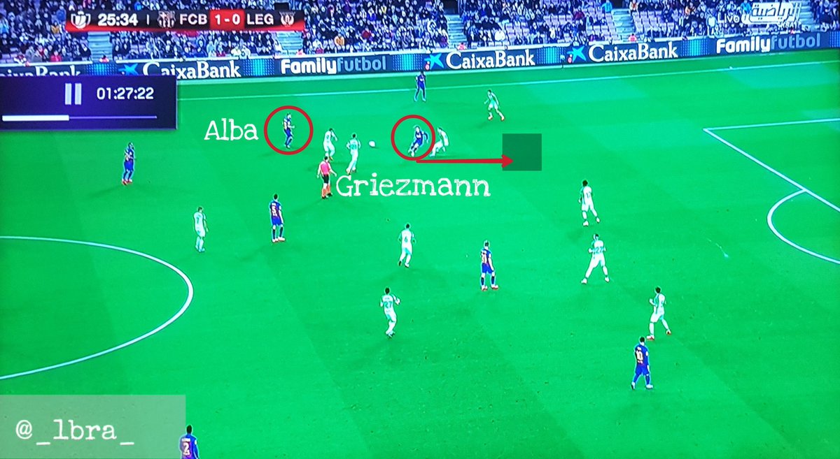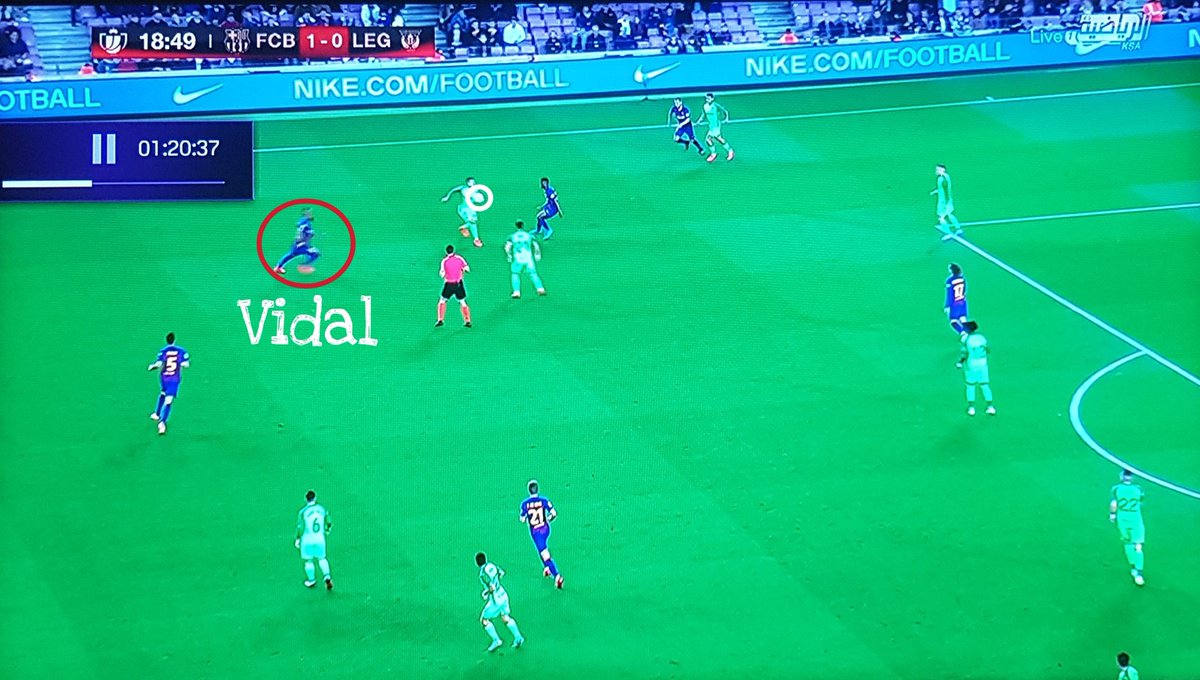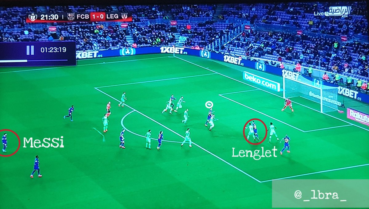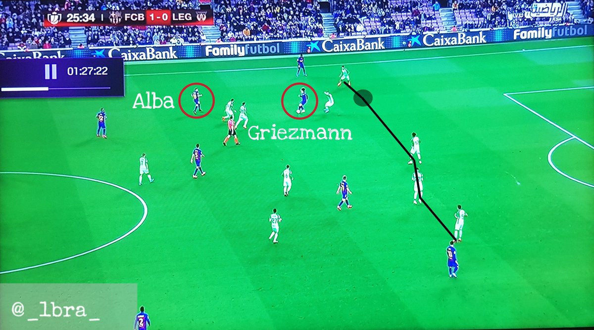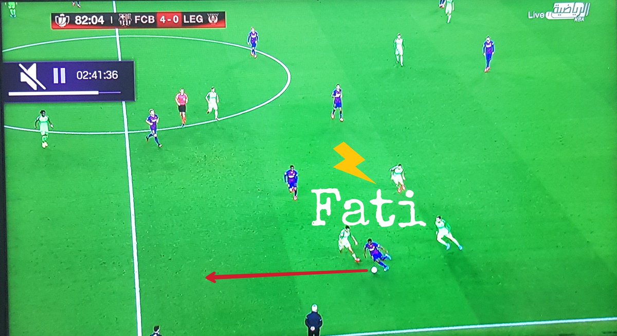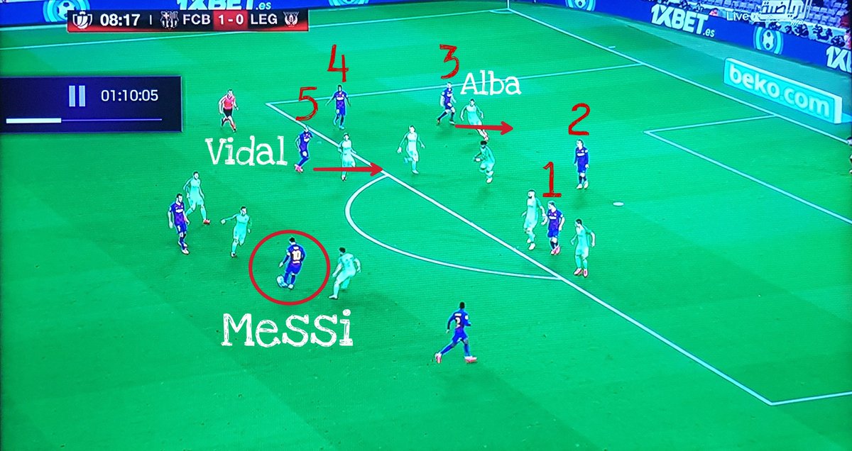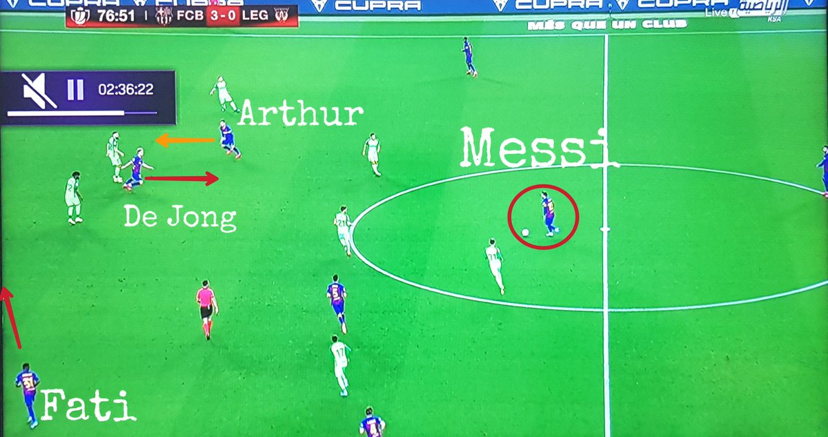 0️⃣1️⃣ تغير جهة العب : واحد من إيجابيات الفريق أمام ليغانيس سرعة تغير الكرة من جهة لأخرى نحو الاعب الحر البعيد عن الضغط في المساحة الخالية . نلاحظ هنا مثلا ميسي يغير الكرة بإتجاه البا في الجهة الأخرى