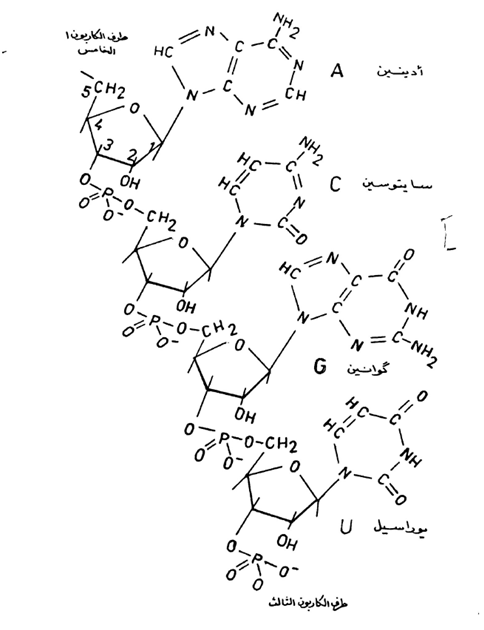 يتألف الحمض النووي من جزيئات حامض الفوسفوريك وسكر خماسي من نوع رايوزي في حالة RNA أو من نوع ديوكسي رايبوز في حالة DNA بالإضافة إلى القواعد النيتروجينية التي تتركب من يوراسيل U ، سايتوسين C ، أدنين A , جوانين G . في الحامض النووي RNA .