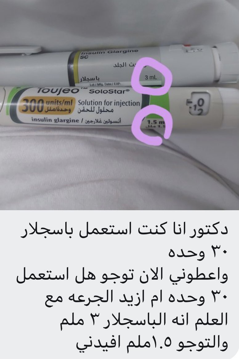 ⬅️عند استبدال أنسولين لانتوس أو باسجلار بالأنسولين توجيو يتم اخذ نفس الجرعة.
