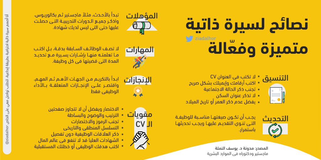 @Dr_Wafy @mkatouah @NoonEdu @_Maharah @edraak @Rwaq @EdlalOrg @EthraiSA @aanaabcom @YousefAlnamlah @Enr_des @8pixelco @Mohmdology @DesMeet وهنا بعض النصائح لكتابة سيرة ذاتية متميزة