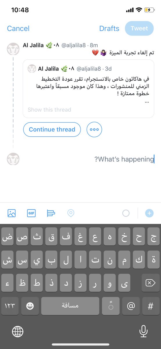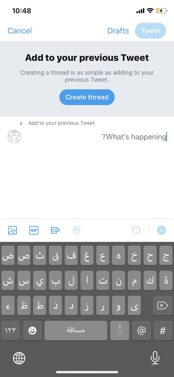 لما بتكتبوا تغريدة عادية، سحبوا على تحت في حالة تريدوا تضيفوا التغريدة لسلسلة thread سابقة، أو تغريدة سابقة!