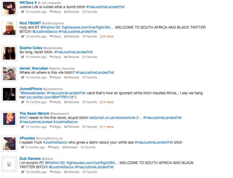 في العشرين من ديسمبر عام٢٠١٣، كانت جستين ساكو المديرة التنفيذية للتواصل في شركة انتر اكتيف كورب في المطار تستعد لركوب رحلتها متوجهة من #نيويورك إلى جنوب أفريقيا للإجازة. كان المطار مزدحما جدا والجو بارد إلى حد كبير..
