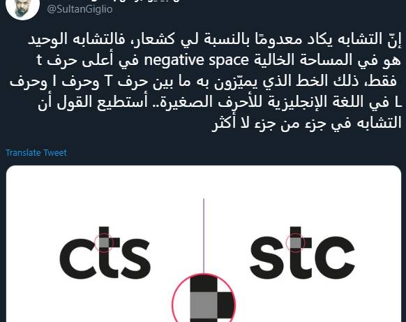 ولكن ليس في حالة شركة الاتصالات السعودية حيث أن المفهوم الكامن خلف الشعار كان مفاجئ وذكي نسبياً أنا لا اقول انه شيء ثوري لكنه واضح وفعال ومثير للإعجاب. ويقول بخصوص موضوع تشابه شعار STC مع CTS دعونا لا نناقش هذا الموضوع لأننا لانعلم ما اذا كان شعار CTS أصلياً في الأساس!