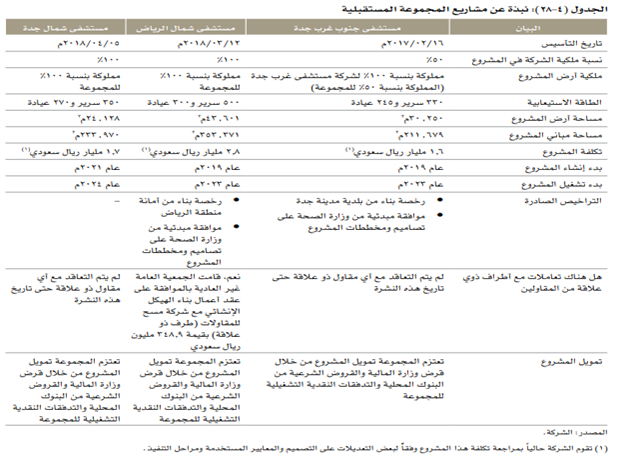 5) مستشفى الخبر تملك المجموعة 50%( شراكة مع شركة جرير الاستثمارية ). 6) مستشفى الريان – الرياض. 7) مستشفى غرب التخصصي. وتشغل وتدير المركزالطبي الجامعي التابع لمدينة الملك عبدالله الطبية في البحرين بالاضافة الى ست اقسام عناية مركزية تابعة لوزارة الصحة. - تابع -