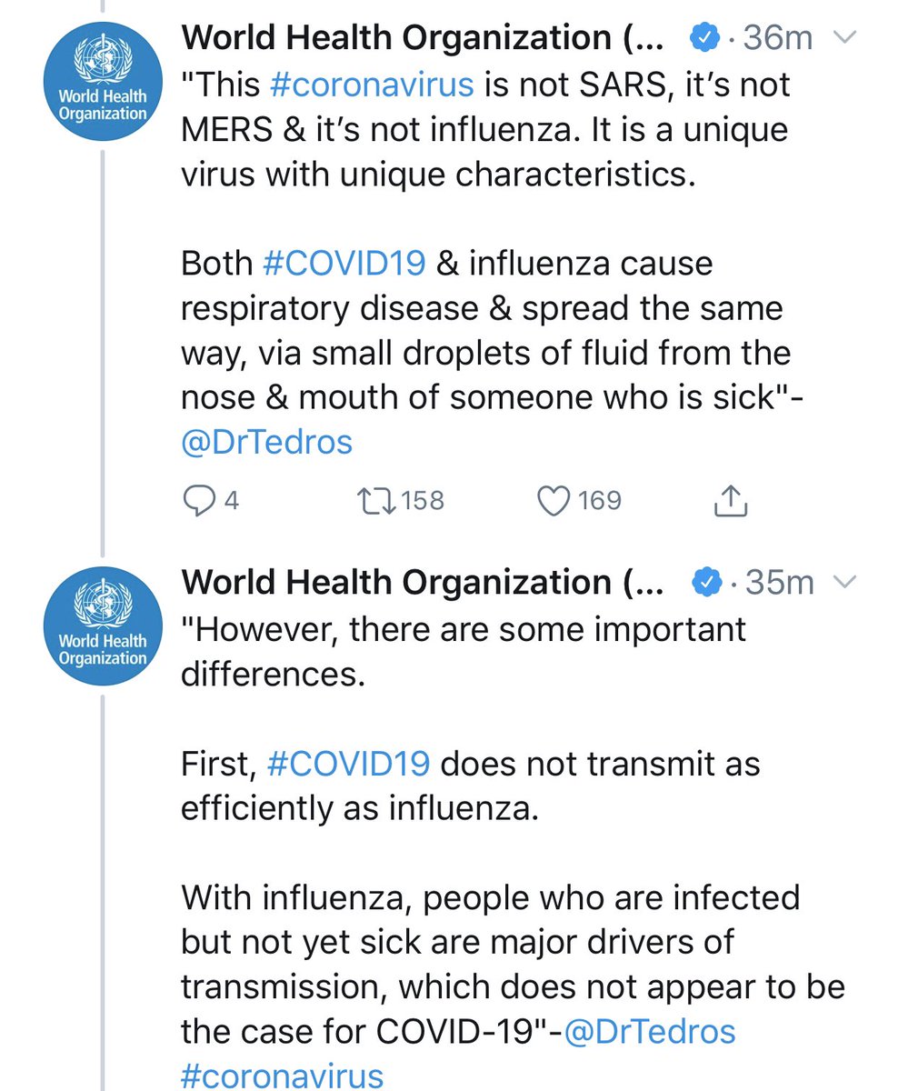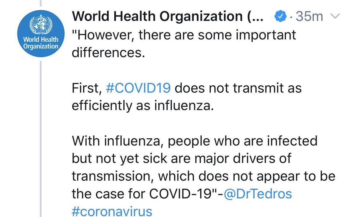 مع الإنفلونزا ينتقل المرض من الشخص حتى لو لم تكن لديه أعراض.. بينما الوضع مختلف مع الكورونا الجديد (أي أنه لا ينتقل من الذي ليس لديه أعراض)