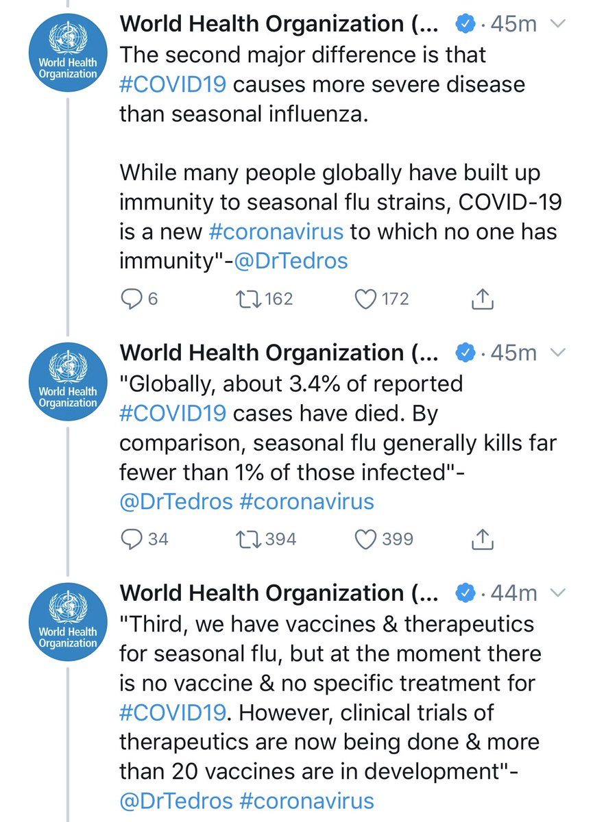 حول العالم ٣.٤٪ مِن الحالات توفيت بينما تقتل الإنفلونزا أقل من ١٪ مِن المصابين.