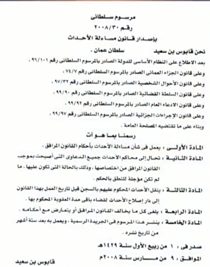 2008م.. صدر المرسوم السلطاني رقم 30/2008م في شأن قانون مساءلة الأحدث.. وترجمة لذلك أنشأت شرطة عمان السلطانية وحدة شرطة الأحداث بمحافظة مسقط.