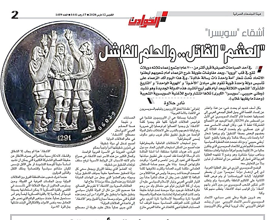 الوضع السويسري المزري في نظر العقلية العربية أدى إلى إزدهار دولة "سويسرا" دون أن يضطر "الكاثوليك" لإبادة "البروتستانت" أويتم فرض اللغة الألمانية على الأقاليم الناطقة بالفرنسية ولم يتطلب الأمر تذكير الشعب السويسري من حين لآخر بأنهم "أشقاء"وأن الواجب تجاه "الأشقاء" يتطلب كذا وكذا.6