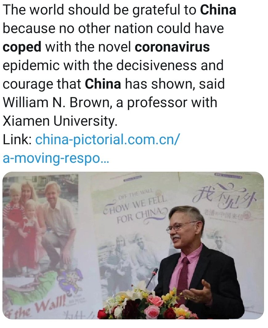 "على العالم أن يكون ممتنا لما فعلته الصين، فما من أمة أخرى كانت لتنجح بكبح جماح انتشار وباء فيروس كورونا الجديد بالحزم والشجاعة التي أظهرتها": كلمات قالها البروفيسور ويليام براون من جامعة زيامين.