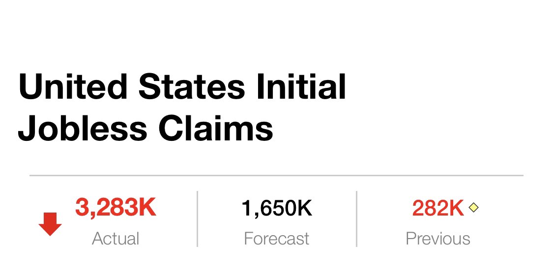 قبل هذا الأسبوع كان في أمريكا كلها مايقارب ال6 مليون عاطل، وخلال أسبوع واحد فقط انضم إلى هؤلاء العاطلين مانسبته 55% من العاطلين الحاليين. وهذا يعني رفع نسبة البطالة إلى 5.5% من 3.5%. الأسواق لم تتفاعل كثيراً لأنها توقعت هذا الارتفاع التاريخي مسبقا مع تفاوت في الأرقام.