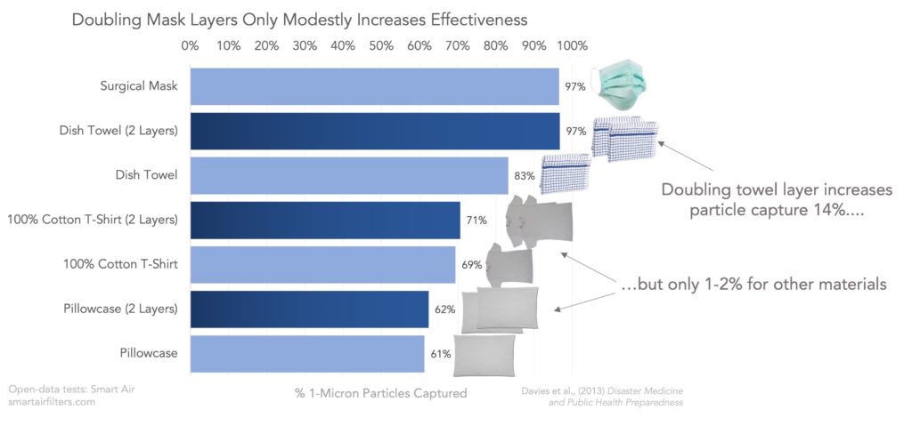 نتایج نشان میدهند که به طور کلی دولایه کردن چندان کمکی نمیکند. در این میان تنها دستمال آشپزخانه بود که با دولایه کردنش حدود ۱۴% به قدرت فیلتراسیون آن اضافه شده و با این کار کاراییاش به حد ماسک جراحی رسیده است.