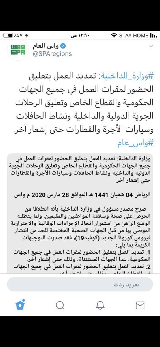 البعض يقول الدولة وقفت العمل و و الخ .. القرارات لا يعني الايقاف بالكامل ولكن بنسبه معينة ولا يكون فيه تجمع موظفين .. لذلك لو طلب منك صاحب العمل تداوم تداوم في الاوقات العادية بحيث يكون نهاية العمل قبل #حظر_التجول ..