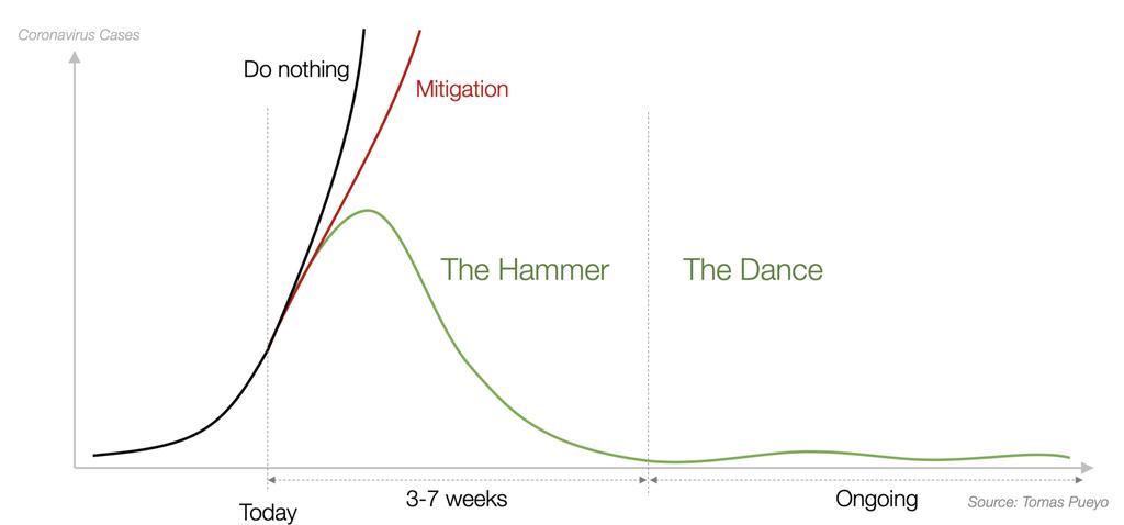 بس الخيار دا في كورونا بعني موت الملايين في العالم في الموجة الاولي بس وحتتكرر الموجات بصورة غير منتظمة وعشوائية بس علي اصغر شوية خلال السنة ونصف القادمة ، ودي تكلفة عالية شديد علي الروح البشرية والعالم ، الخيار التاني مثال التجربة الصينية ودي استراتجية اسمها القمع suppression⏬