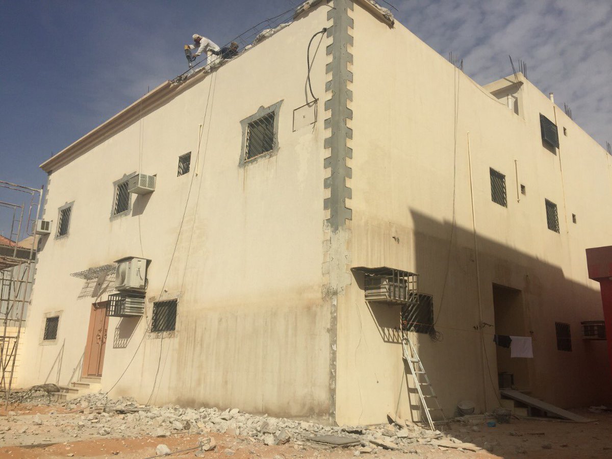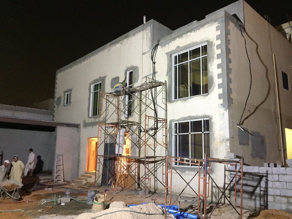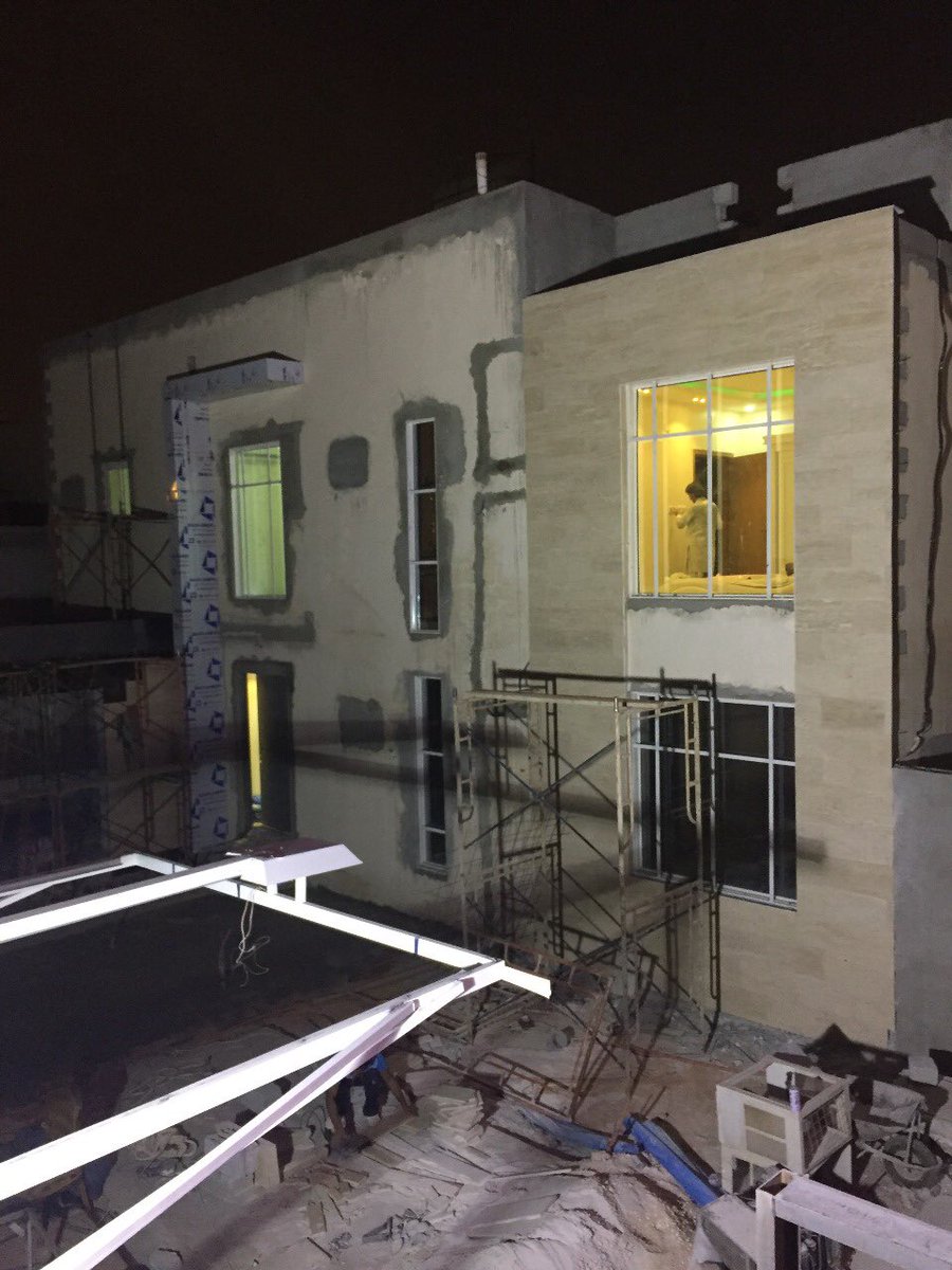 تركيب الحجر والشبابيك والكتل البارزه ووقتها تم الانتهاء من بناء ملحق خارجي