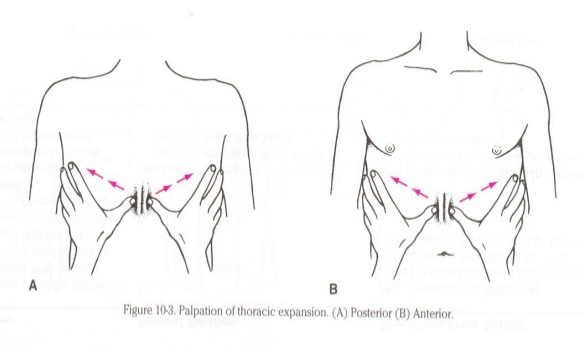 ١- الفحص بالنظر (Inspection): هنا راح نشوف طريقة تنفس المريض هل هي سريعة او منتظمة، وجود سعال ؟ هل السعال جاف او يوجد بلغم مع الاخذ با الاعتبار عمر المريض ف السعال الجاف في صغار الاعمار ممكن يشير الى (asthma) في كبار السن ممكن (ILD)