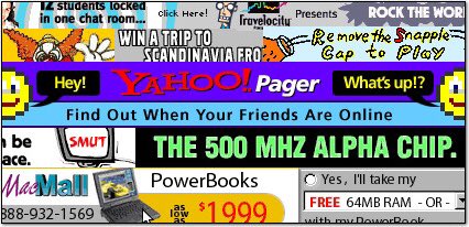 بعدها بدأت المواقع الإلكترونية مثل Yahoo , AOL و Excite باستغلال المساحات الإعلانية في مواقعهم . ومن خلال التحول للإعلانات الرقمية ظهرت العديد من الإعلانات المتنوعة ويتذكرها من عاصروا تلك الفترة مثل إعلانات pop up , shiny, super big, small.