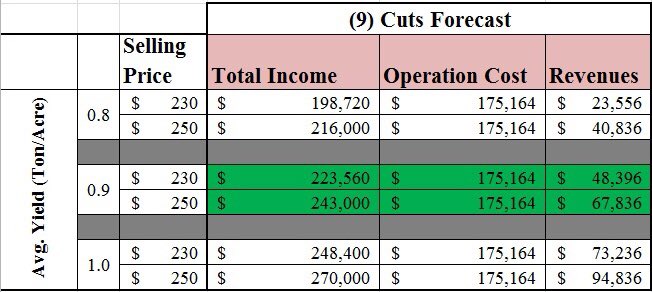 ولكن كما قولت أن موضوع البرسيم معقد وحساس، لذا لا تطمح للإنتاجية الأعلى، بل خذ بعين الإعتبار الإنتاجية المتوسطة التي أشرت اليها باللون الأخضر في جزئية ال٩ قطعات، كي لا تفاجئ وتصاب بالإحباط.
