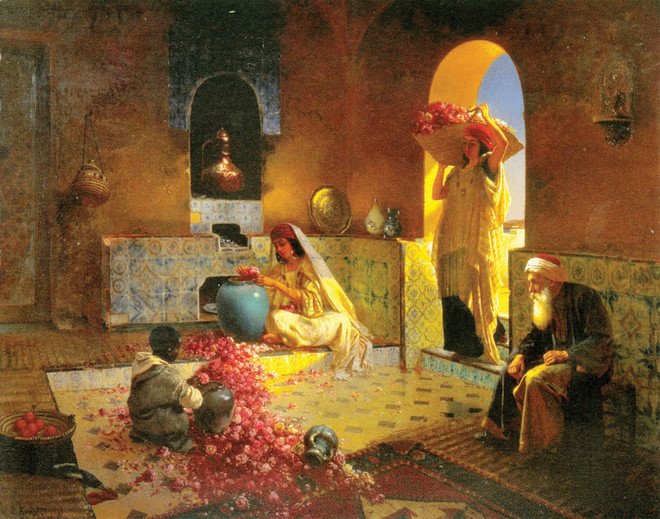 من قديم الزمان والعرب يقتنون اجود انواع البخور والمسك والصندل ويخلطون الورود ببعضها لإنتاج العطور ويكتبون عن مركباتها ولعل أشهر من كتب عنها ابن سينا والكندي