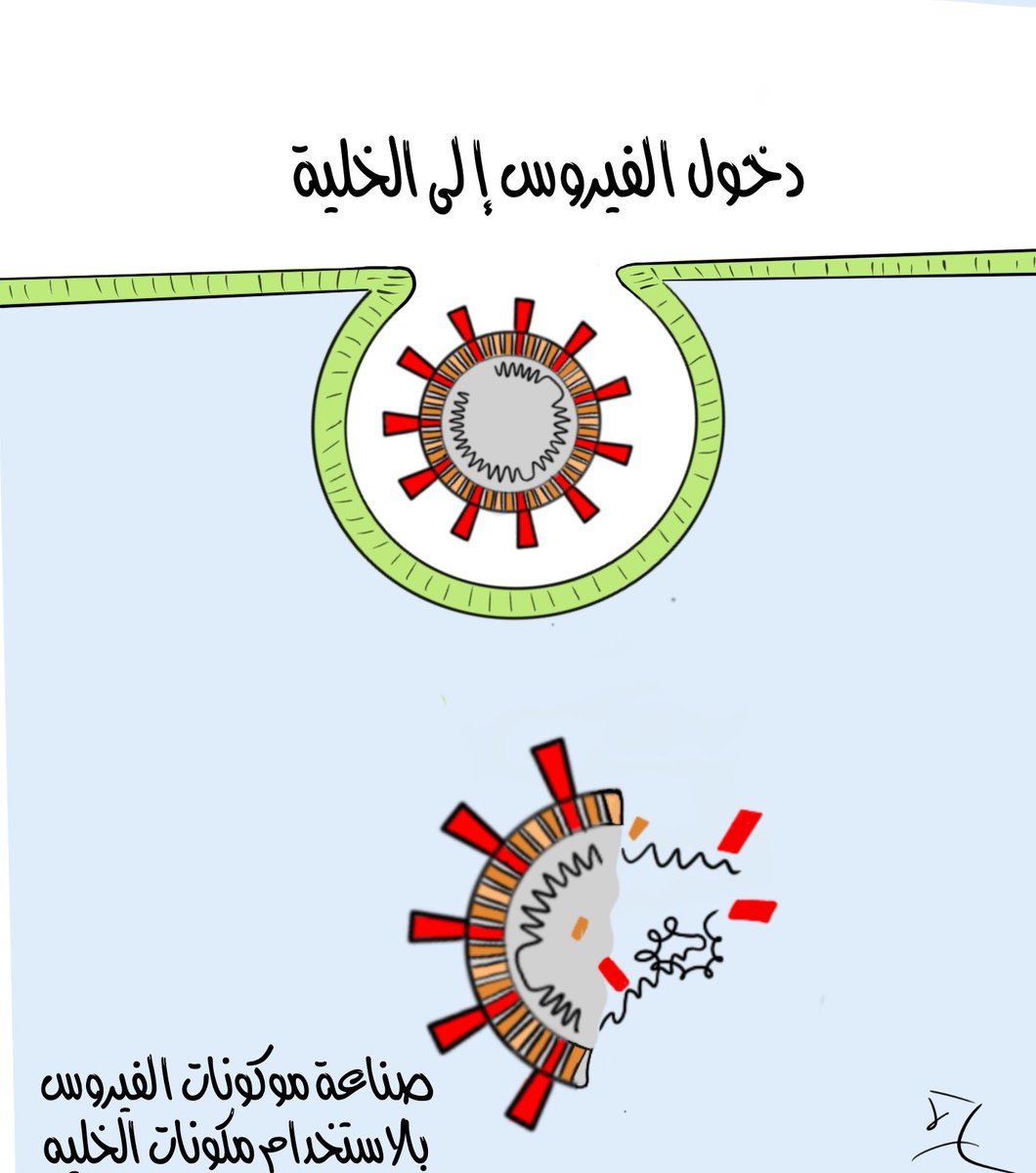 8-ينتقل الفيروس الأن من إنسان الى أخر عن طريق الرذاذ التنفسي أو عند ملامسة يد ملوثة بالفيروسات العين أو الوجه ليبدا الفيروس دورة التكاثر في الأنسان من مدخل الجهاز التنفسي