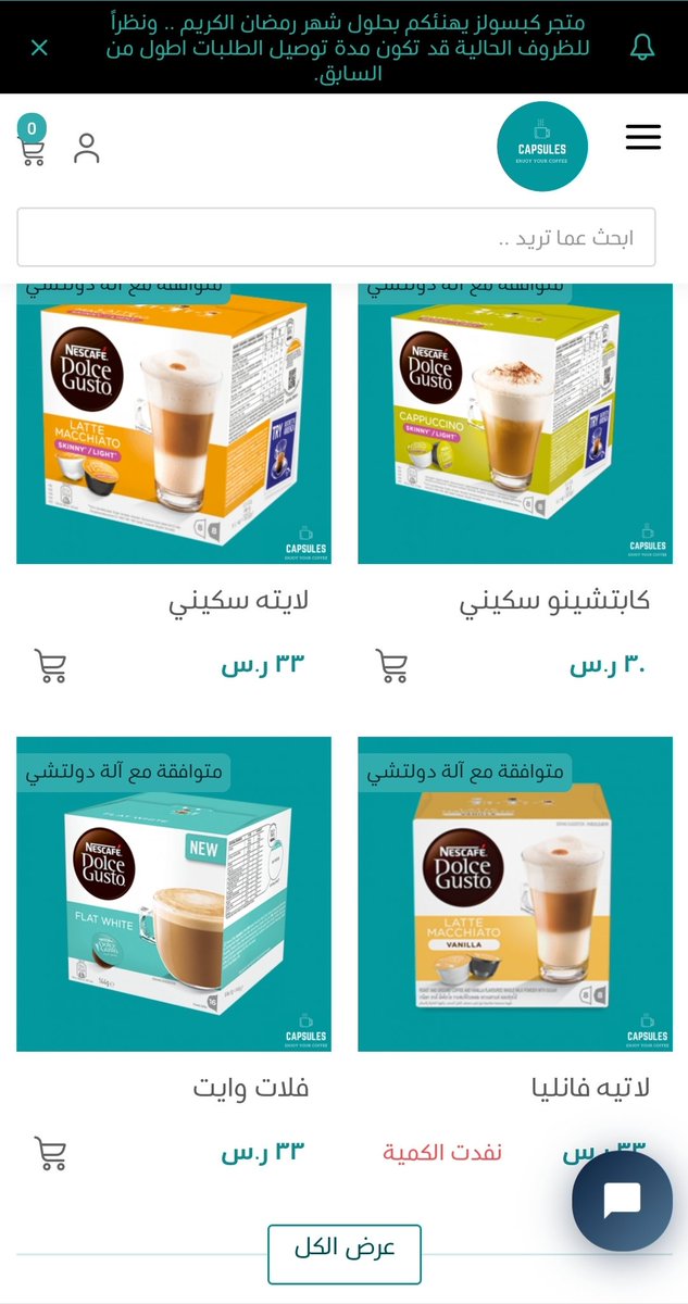 و تتوفر كبسولات القهوه مثل نسبريسو و دولتشي و ستاربكس و ايلي