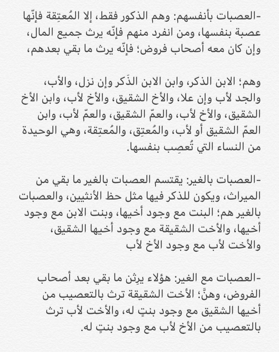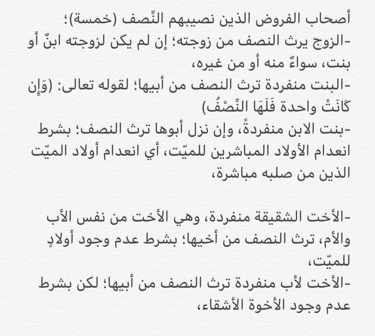 ١- أصحاب " الفروض المقدرة " في كتاب الله تعالى ستة (٦) وهي؛ النِّصف، والرُّبُعُ، والثُّمُنُ، والثُّلُثان، والثُّلُث، والسُّدُسُ