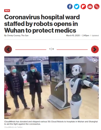 تمكن الروبوتات الطاقم الطبي ليس فقط من التواصل عن بعد مع المرضى ، بل وأخذ العلامات الحيوية، مما يحمهم والمرضى الآخرين، وقد تم تزويد جناح في مستشفى Wuchang field بروبوتات تعمل على 5G