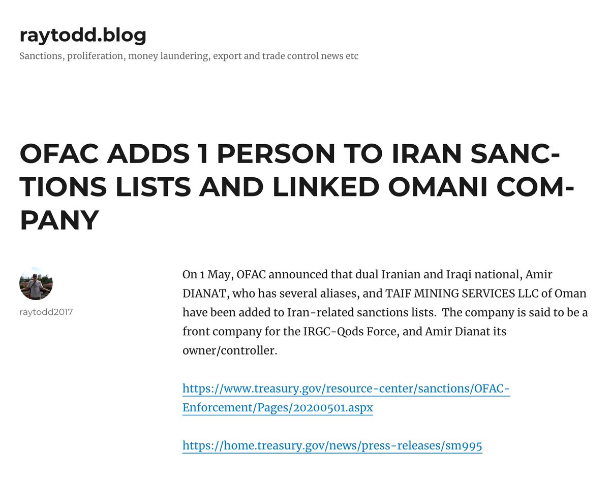 الولايات المتحدة تفرض عقوبات على شركة عمانية أسمها "طايف للتعدين" بسبب خرقها لحظر تصدير الأسلحة لإيران،وصاحبها عامر عبد العزيز جعفر المذحجي يتحرك تجاريا باسم أمير ديانات حيث يعمل لصالح الحرس الثوري الإيراني، يورد ويصدر أسلحة لصالح الحرس، كما يقوم بغسيل أموال لصالح الإيرانيين.