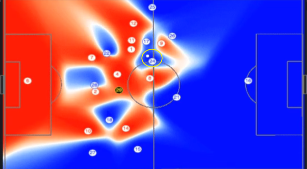 في الصورة تظهر المساحة الزرقاء من الملعب التي يسيطر عليها #ليفربول والمساحة الحمراء التي يسيطر عليها الخصم وفي الدائرة الصفراء يملك لاعب ليفربول الكرة، وبالتالي فإن التمرير يجب أن تكون في منطقة يسيطر عليها اللون الأزرق.
