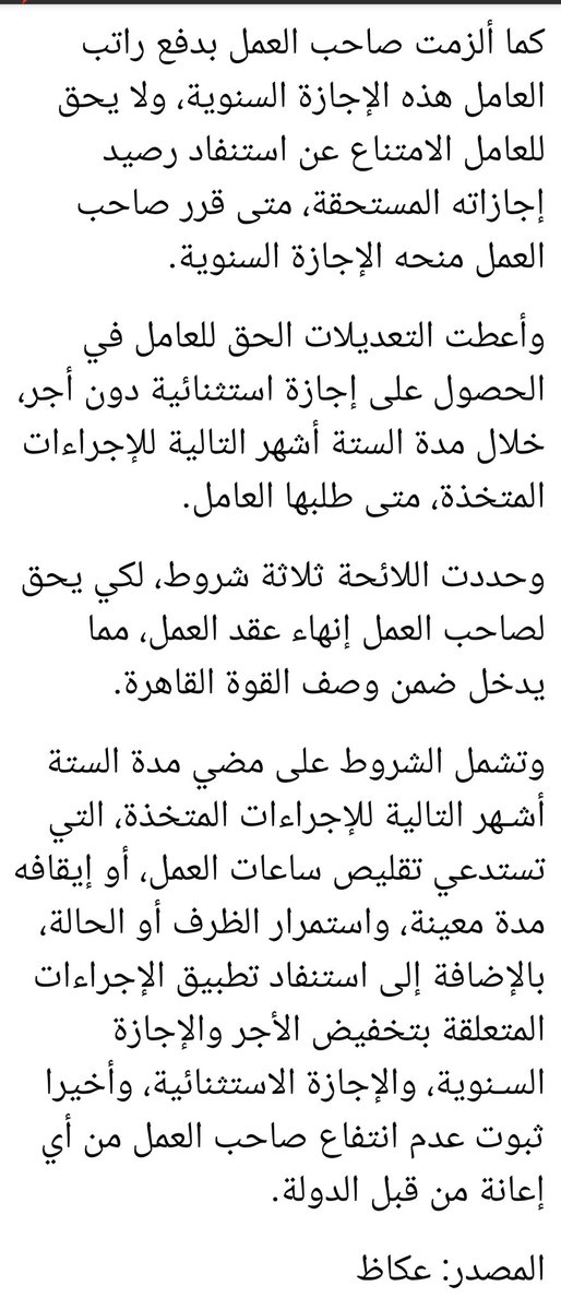 وأعطت التعديلات الحق للعامل في الحصول على إجازة استثنائية دون أجر، خلال مدة الستة أشهر التالية للإجراءات المتخذة، متى طلبها العامل.