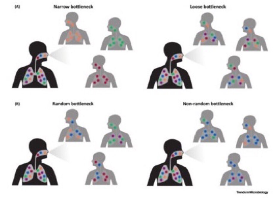 بالإضافة إلى ان معدلات الطفرة الفيروسية ، لدينا أيضًا ظاهرة أخرى من اختناقات الإرسال. لن أغوص في هذا أكثر من اللازم ، لكن هذا يعني ببساطة أنه لا تنتقل جميع طفرات الفيروس المختلفة من مريض واحد إلى المريض التالي(١٣)