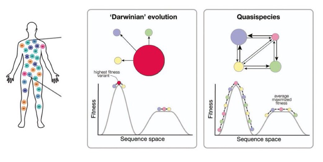 فيما يتعلق بهذا ، تجدر الإشارة أيضًا إلى أنه لا يوجد "فيروس" يصيب شخصًا فحسب ، بل تُشّكل الفيروسات من مجموعة سكان اصابتهم الفيروسات حيث يكون معظمها متماثلًا ، لكن بعضها سيختلف في بعض المميزات.(١٧)