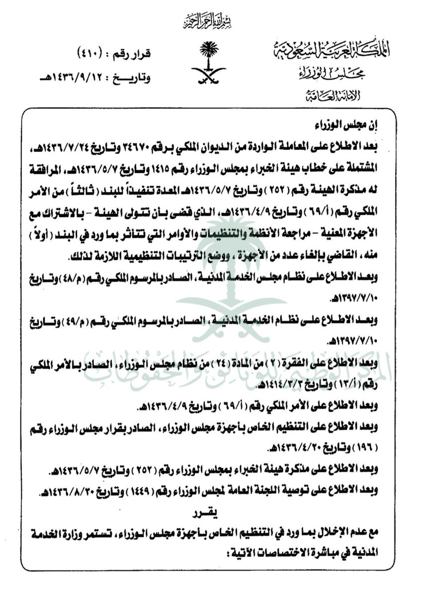 @ssnady592 3. وهنا قرار مجلس الوزراء رقم (410) وتاريخ 1436/9/12هـ القاضي بأن تستمر وزارة الخدمة المدنية في مباشرة عدد من الاختصاصات والتي كانت من اختصاص مجلس الخدمة المدنية الملغى بموجب الأمر الملكي رقم (أ/69) وتاريخ 1436/4/9هـ