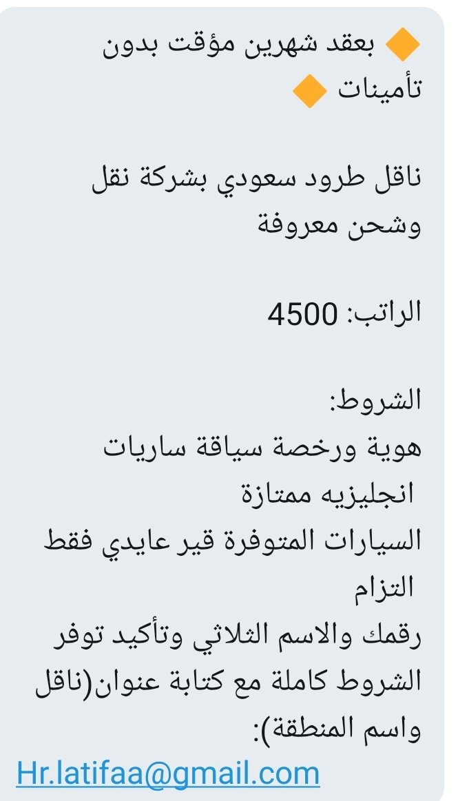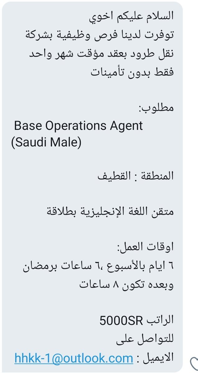 شركه نقل تبحث عن ناقل طرود سعودي بعقد مؤقت براتب ٤٥٠٠ في كل من #القصيم و #الاحساء بدون التسجيل بالتأمينات شرط اجاده اللغة الانجليزية ورخصة قيادة سارية latifaabudalli@outlook.com