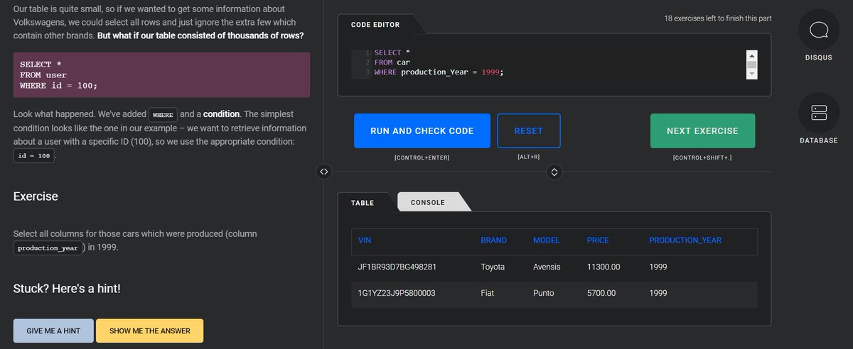 موقع يقدم لك كورسات متنوعه لتعلم لغة SQL في قواعد البيانات ،في كل كورس تبدأ بالتعلم أولاً ، ثم التطبيق بالتمارين، وبعد ذلك تقدم لك اختبار لتحلّه (علماً بأن في بعض الكورسات قاعدة البيانات تكون جاهزة لكتابة أي استعلام).