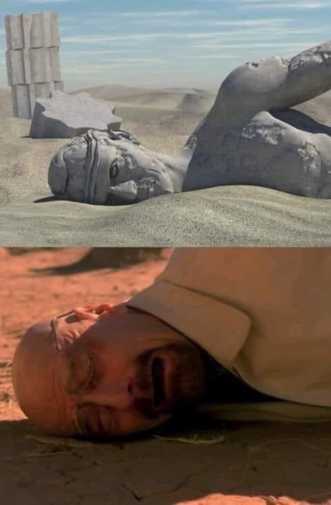 التمثال لأوزيماندياس ملك الملوك، رمسيس الثانى يظهر محطم وحيد بدون شعبه و حضارته التي بناها رغم أنه كان يوما ملكا عظيما يبث الرعب في قلوب أعدائه