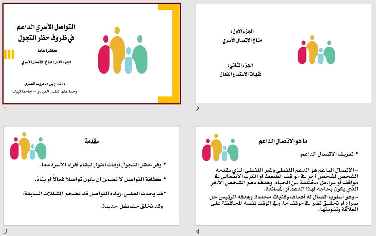 سأضع تحت هذه التغريدة شرائح محاضرتي العامة بعنوان (الاتصال الأسري الداعم في ظروف حظر التجول). مع الشكر الجزيل لمجموعة قادر @qader2019 (أصدقاء تعزيز الصحة النفسية بتبوك).