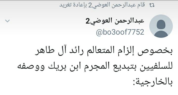 » الأول أن يكتب منشورا يعلن فيه «أن حساب عبد الرحمن العوضي2» حساب آخر له؟! ويبين لنا سبب وضع صورة جامع «بدري العتيبي» الذي يصلي فيه الشيخ محمد بن هادي؟!